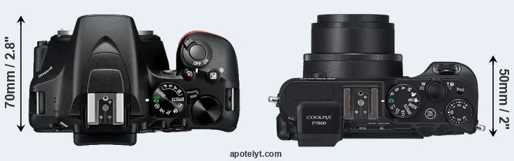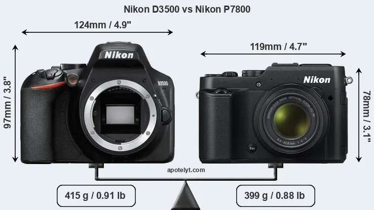 An illustration of the physical size and weight of the Nikon D3500 and the Nikon P7800 is provided in the side-by-side display below. The two cameras are presented according to their relative size. Three consecutive perspectives from the front, the top, and the back are available. All width, height and depth measures are rounded to the nearest millimeter.