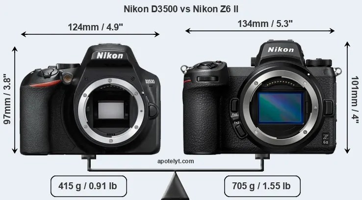 If the front view area (width x height) of the cameras is taken as an aggregate measure of their size, the Nikon Z6 II is notably larger (13 percent) than the Nikon D3500. Moreover, the Z6 II is substantially heavier (70 percent) than the D3500. It is noteworthy in this context that the Z6 II is splash and dust-proof, while the D3500 does not feature any corresponding weather-sealing.