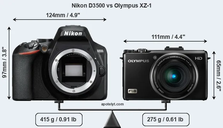 The physical size and weight of the Nikon D3500 and the Olympus XZ-1 are illustrated in the side-by-side display below. The two cameras are presented according to their relative size. Three consecutive views from the front, the top, and the rear side are shown. All size dimensions are rounded to the nearest millimeter.