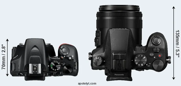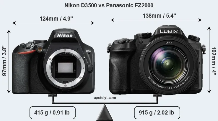 The side-by-side display below illustrates the physical size and weight of the Nikon D3500 and the Panasonic FZ2000. The two cameras are presented according to their relative size. Three consecutive views from the front, the top, and the rear side are shown. All width, height and depth dimensions are rounded to the nearest millimeter.