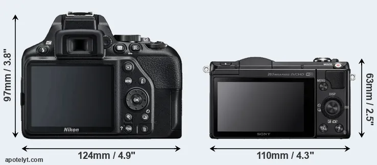 The side-by-side display below illustrates the physical size and weight of the Nikon D3500 and the Sony A5000. The two cameras are presented according to their relative size. Three consecutive perspectives from the front, the top, and the back are available. All width, height and depth measures are rounded to the nearest millimeter.