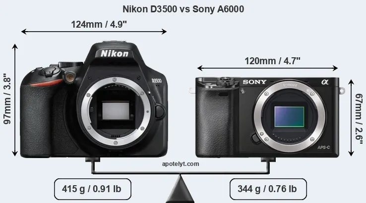 If the front view area (width x height) of the cameras is taken as an aggregate measure of their size, the Sony A6000 is considerably smaller (33 percent) than the Nikon D3500. Moreover, the A6000 is markedly lighter (17 percent) than the D3500. In this context, it is worth noting that neither the D3500 nor the A6000 are weather-sealed.
