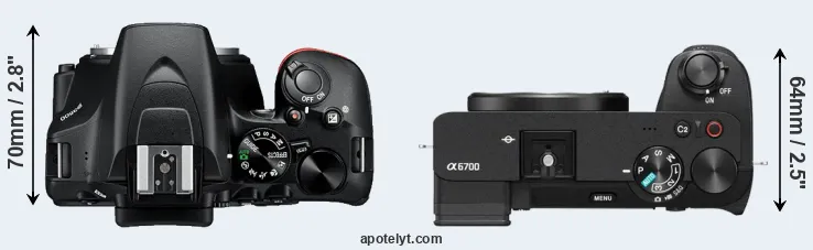 The physical size and weight of the Nikon D3500 and the Sony A6700 are illustrated in the side-by-side display below. The two cameras are presented according to their relative size. Three consecutive views from the front, the top, and the rear side are shown. All size dimensions are rounded to the nearest millimeter.