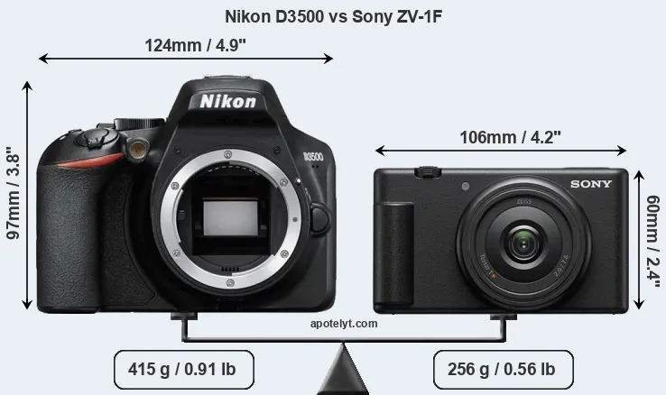 An illustration of the physical size and weight of the Nikon D3500 and the Sony ZV-1F is provided in the side-by-side display below. The two cameras are presented according to their relative size. Three consecutive views from the front, the top, and the rear side are shown. All size dimensions are rounded to the nearest millimeter.