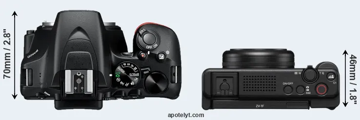 The above size and weight comparisons are to some extent incomplete and possibly misleading, as the ZV-1F has a lens built in, whereas the D3500 is an interchangeable lens camera that requires a separate lens. Attaching the latter will add extra weight and bulk to the setup. You can compare the optics available for the D3500 and their specifications in the Nikon Lens Catalog.