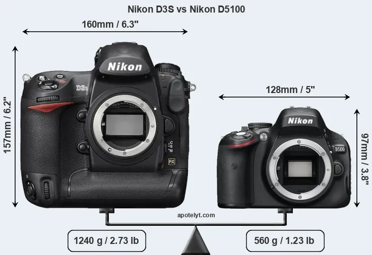 The physical size and weight of the Nikon D3S and the Nikon D5100 are illustrated in the side-by-side display below. The two cameras are presented according to their relative size. Three successive views from the front, the top, and the rear are shown. All width, height and depth measures are rounded to the nearest millimeter.