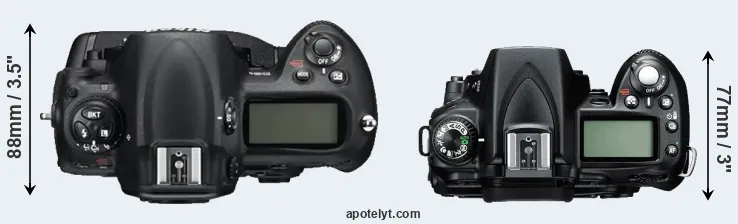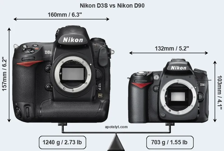 An illustration of the physical size and weight of the Nikon D3S and the Nikon D90 is provided in the side-by-side display below. The two cameras are presented according to their relative size. Three consecutive perspectives from the front, the top, and the back are available. All width, height and depth dimensions are rounded to the nearest millimeter.