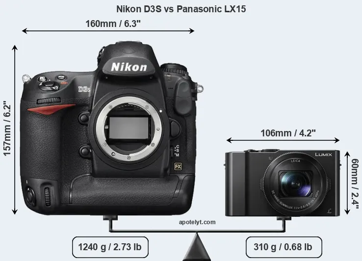 An illustration of the physical size and weight of the Nikon D3S and the Panasonic LX15 is provided in the side-by-side display below. The two cameras are presented according to their relative size. Three consecutive perspectives from the front, the top, and the back are available. All width, height and depth dimensions are rounded to the nearest millimeter.