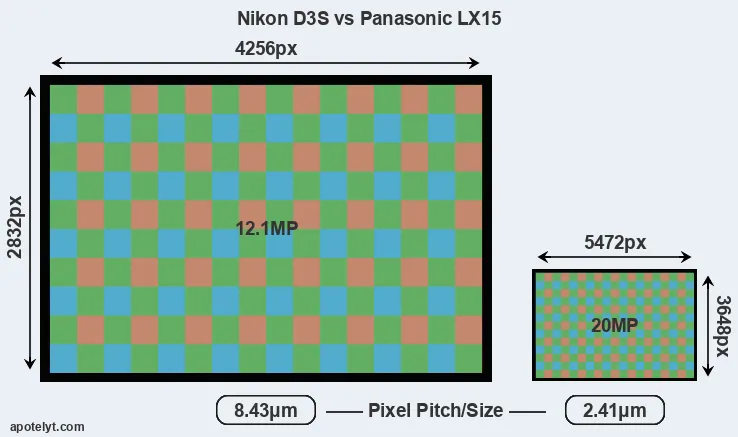 Despite having a smaller sensor, the LX15 offers a higher resolution of 20 megapixels, compared with 12.1 MP of the D3S. This megapixels advantage comes at the cost of a higher pixel density and a smaller size of the individual pixel (with a pixel pitch of 2.41μm versus 8.43μm for the D3S). However, it should be noted that the LX15 is much more recent (by 6 years and 11 months) than the D3S, and its sensor will have benefitted from technological advances during this time that make it possible to gather light more efficiently.