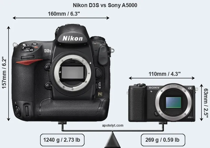 The physical size and weight of the Nikon D3S and the Sony A5000 are illustrated in the side-by-side display below. The two cameras are presented according to their relative size. Three consecutive views from the front, the top, and the rear side are shown. All size dimensions are rounded to the nearest millimeter.