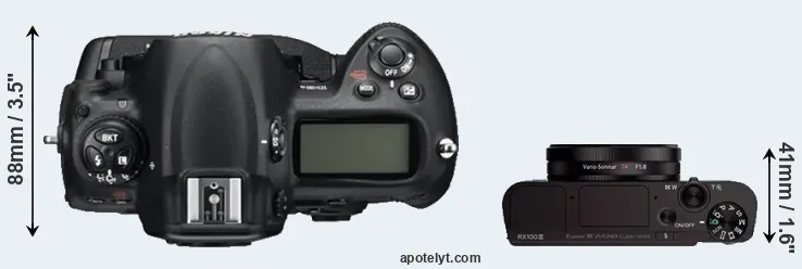 If the front view area (width x height) of the cameras is taken as an aggregate measure of their size, the Sony RX100 III is considerably smaller (76 percent) than the Nikon D3S. It is worth mentioning in this context that the D3S is splash and dust resistant, while the RX100 III does not feature any corresponding weather-sealing.