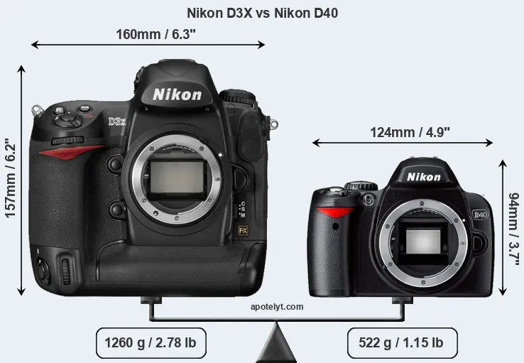 An illustration of the physical size and weight of the Nikon D3X and the Nikon D40 is provided in the side-by-side display below. The two cameras are presented according to their relative size. Three consecutive perspectives from the front, the top, and the back are available. All size dimensions are rounded to the nearest millimeter.