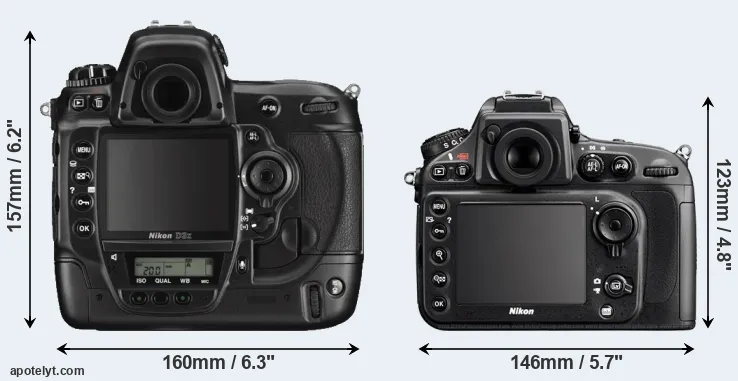 An illustration of the physical size and weight of the Nikon D3X and the Nikon D800 is provided in the side-by-side display below. The two cameras are presented according to their relative size. Three consecutive views from the front, the top, and the rear side are shown. All width, height and depth dimensions are rounded to the nearest millimeter.