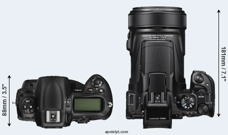 An illustration of the physical size and weight of the Nikon D3X and the Nikon P1000 is provided in the side-by-side display below. The two cameras are presented according to their relative size. Three successive views from the front, the top, and the rear are shown. All size dimensions are rounded to the nearest millimeter.