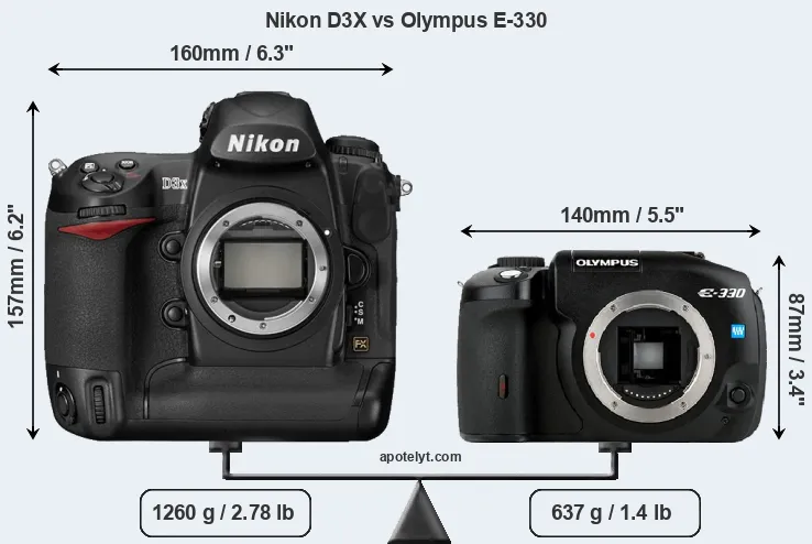 An illustration of the physical size and weight of the Nikon D3X and the Olympus E-330 is provided in the side-by-side display below. The two cameras are presented according to their relative size. Three successive views from the front, the top, and the rear are shown. All size dimensions are rounded to the nearest millimeter.