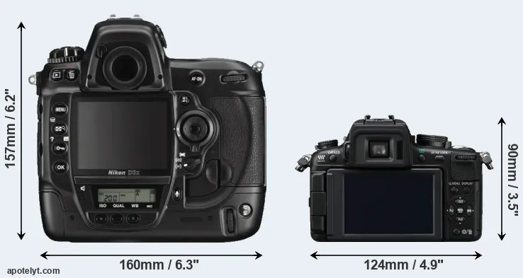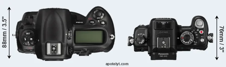 The side-by-side display below illustrates the physical size and weight of the Nikon D3X and the Panasonic GH2. The two cameras are presented according to their relative size. Three consecutive views from the front, the top, and the rear side are shown. All width, height and depth dimensions are rounded to the nearest millimeter.