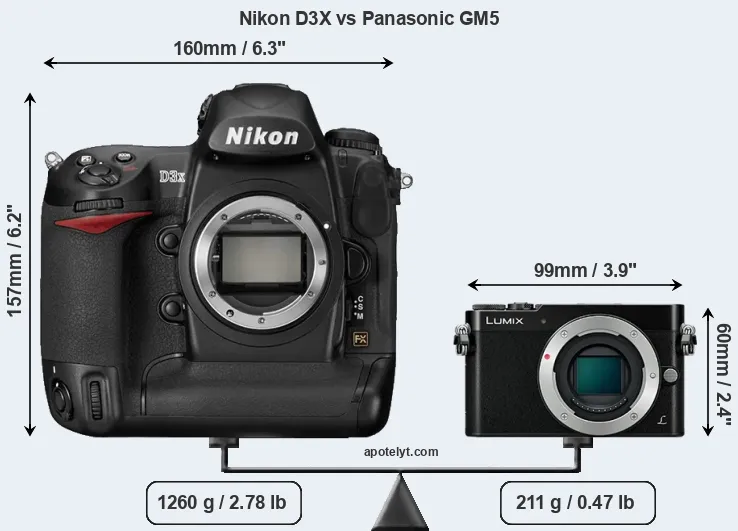 The side-by-side display below illustrates the physical size and weight of the Nikon D3X and the Panasonic GM5. The two cameras are presented according to their relative size. Three successive views from the front, the top, and the rear are shown. All width, height and depth measures are rounded to the nearest millimeter.