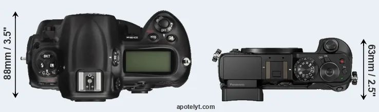 An illustration of the physical size and weight of the Nikon D3X and the Panasonic GX8 is provided in the side-by-side display below. The two cameras are presented according to their relative size. Three consecutive perspectives from the front, the top, and the back are available. All width, height and depth measures are rounded to the nearest millimeter.