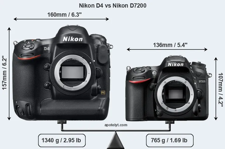 If the front view area (width x height) of the cameras is taken as an aggregate measure of their size, the Nikon D7200 is considerably smaller (42 percent) than the Nikon D4. Moreover, the D7200 is substantially lighter (43 percent) than the D4. In this context, it is worth noting that both cameras are splash and dust-proof and can, hence, be used in inclement weather conditions or harsh environments.