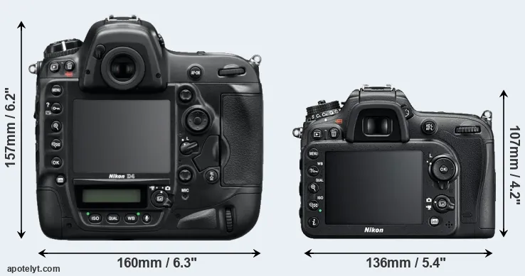 The side-by-side display below illustrates the physical size and weight of the Nikon D4 and the Nikon D7200. The two cameras are presented according to their relative size. Three consecutive views from the front, the top, and the rear side are shown. All size dimensions are rounded to the nearest millimeter.