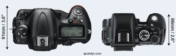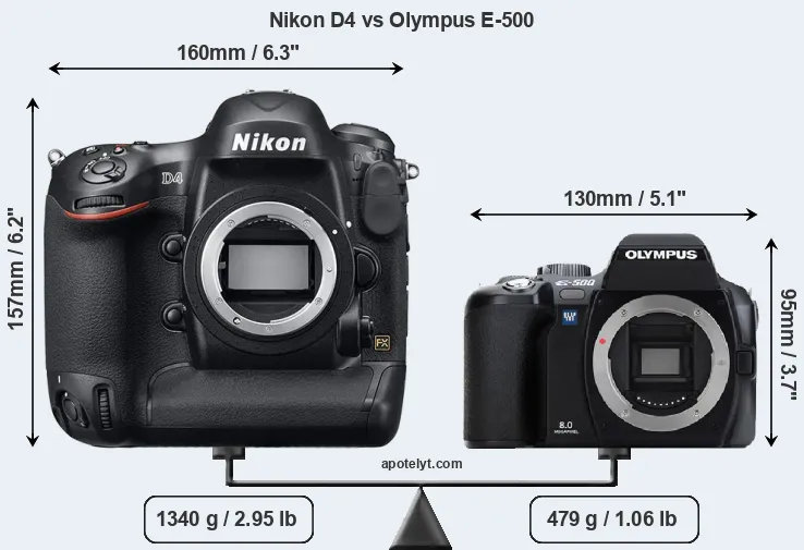 The side-by-side display below illustrates the physical size and weight of the Nikon D4 and the Olympus E-500. The two cameras are presented according to their relative size. Three consecutive views from the front, the top, and the rear side are shown. All width, height and depth measures are rounded to the nearest millimeter.