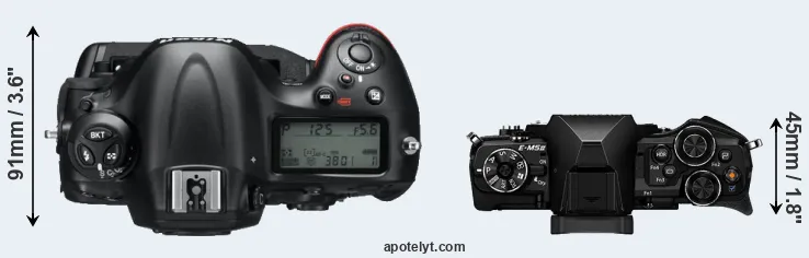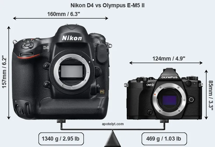 An illustration of the physical size and weight of the Nikon D4 and the Olympus E-M5 II is provided in the side-by-side display below. The two cameras are presented according to their relative size. Three consecutive perspectives from the front, the top, and the back are available. All size dimensions are rounded to the nearest millimeter.