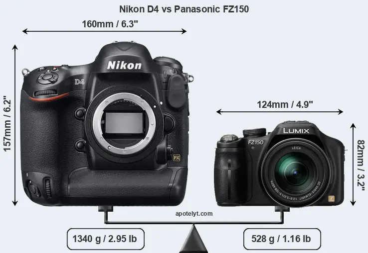 The above size and weight comparisons are to some extent incomplete and possibly misleading, as the FZ150 has a lens built in, whereas the D4 is an interchangeable lens camera that requires a separate lens. Attaching the latter will add extra weight and bulk to the setup. You can compare the optics available for the D4 and their specifications in the Nikon Lens Catalog.