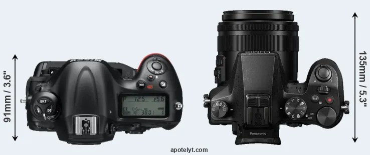 The side-by-side display below illustrates the physical size and weight of the Nikon D4 and the Panasonic FZ2500. The two cameras are presented according to their relative size. Three consecutive views from the front, the top, and the rear side are shown. All width, height and depth dimensions are rounded to the nearest millimeter.