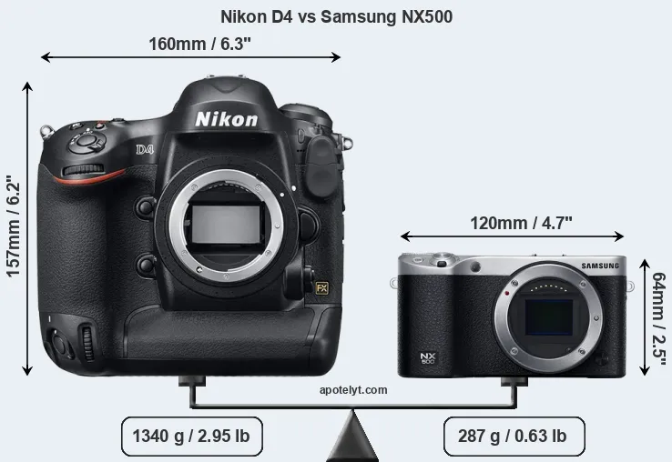 If the front view area (width x height) of the cameras is taken as an aggregate measure of their size, the Samsung NX500 is considerably smaller (69 percent) than the Nikon D4. Moreover, the NX500 is substantially lighter (79 percent) than the D4. It is worth mentioning in this context that the D4 is splash and dust resistant, while the NX500 does not feature any corresponding weather-sealing.