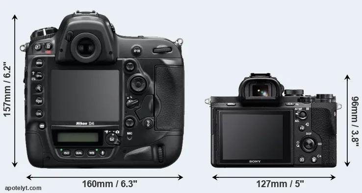 The side-by-side display below illustrates the physical size and weight of the Nikon D4 and the Sony A7 II. The two cameras are presented according to their relative size. Three consecutive perspectives from the front, the top, and the back are available. All width, height and depth dimensions are rounded to the nearest millimeter.