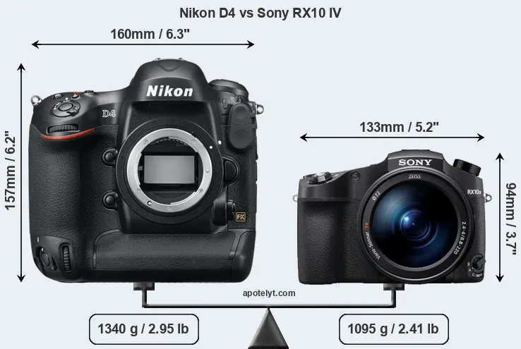 The above size and weight comparisons are to some extent incomplete and possibly misleading, as the RX10 IV has a lens built in, whereas the D4 is an interchangeable lens camera that requires a separate lens. Attaching the latter will add extra weight and bulk to the setup. You can compare the optics available for the D4 and their specifications in the Nikon Lens Catalog.