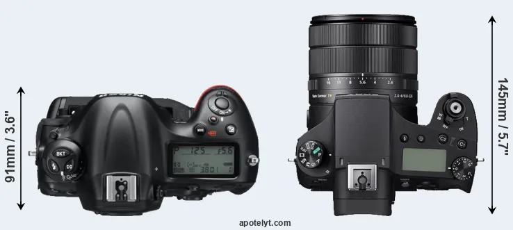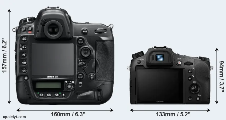 The side-by-side display below illustrates the physical size and weight of the Nikon D4 and the Sony RX10 IV. The two cameras are presented according to their relative size. Three successive views from the front, the top, and the rear are shown. All size dimensions are rounded to the nearest millimeter.