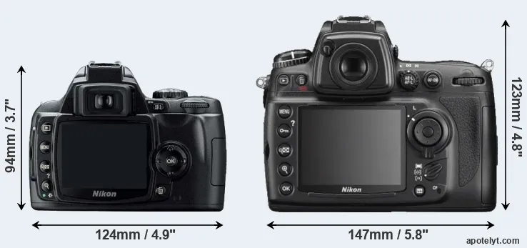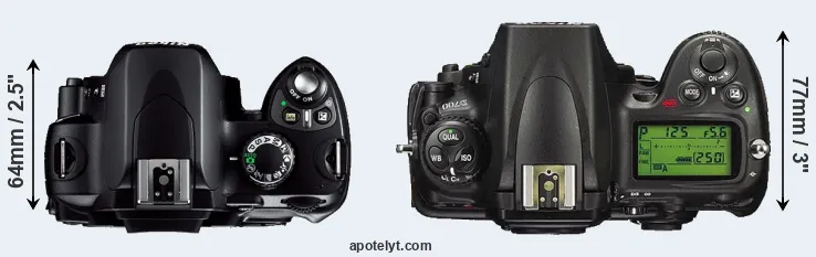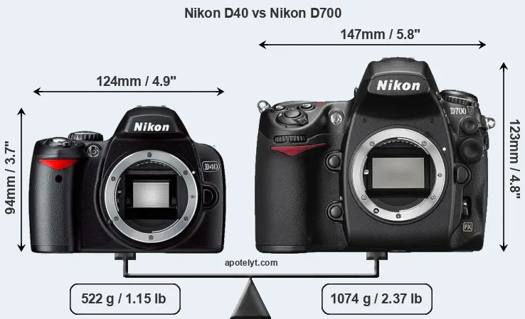 The side-by-side display below illustrates the physical size and weight of the Nikon D40 and the Nikon D700. The two cameras are presented according to their relative size. Three consecutive perspectives from the front, the top, and the back are available. All width, height and depth dimensions are rounded to the nearest millimeter.