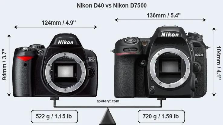 If the front view area (width x height) of the cameras is taken as an aggregate measure of their size, the Nikon D7500 is notably larger (21 percent) than the Nikon D40. Moreover, the D7500 is substantially heavier (38 percent) than the D40. It is noteworthy in this context that the D7500 is splash and dust-proof, while the D40 does not feature any corresponding weather-sealing.