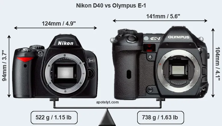 If the front view area (width x height) of the cameras is taken as an aggregate measure of their size, the Olympus E-1 is notably larger (26 percent) than the Nikon D40. Moreover, the E-1 is substantially heavier (41 percent) than the D40. It is noteworthy in this context that the E-1 is splash and dust-proof, while the D40 does not feature any corresponding weather-sealing.