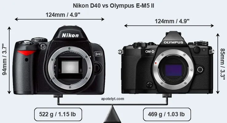 An illustration of the physical size and weight of the Nikon D40 and the Olympus E-M5 II is provided in the side-by-side display below. The two cameras are presented according to their relative size. Three consecutive perspectives from the front, the top, and the back are available. All width, height and depth measures are rounded to the nearest millimeter.
