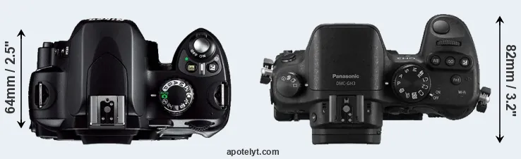 The side-by-side display below illustrates the physical size and weight of the Nikon D40 and the Panasonic GH3. The two cameras are presented according to their relative size. Three consecutive perspectives from the front, the top, and the back are available. All size dimensions are rounded to the nearest millimeter.