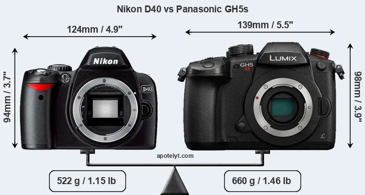 The physical size and weight of the Nikon D40 and the Panasonic GH5s are illustrated in the side-by-side display below. The two cameras are presented according to their relative size. Three successive views from the front, the top, and the rear are shown. All width, height and depth dimensions are rounded to the nearest millimeter.
