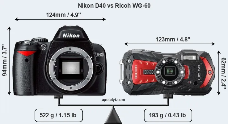 The physical size and weight of the Nikon D40 and the Ricoh WG-60 are illustrated in the side-by-side display below. The two cameras are presented according to their relative size. Three consecutive perspectives from the front, the top, and the back are available. All width, height and depth dimensions are rounded to the nearest millimeter.