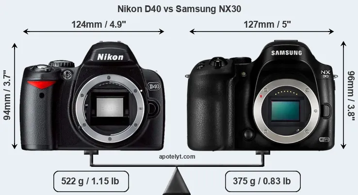 An illustration of the physical size and weight of the Nikon D40 and the Samsung NX30 is provided in the side-by-side display below. The two cameras are presented according to their relative size. Three successive views from the front, the top, and the rear are shown. All width, height and depth dimensions are rounded to the nearest millimeter.