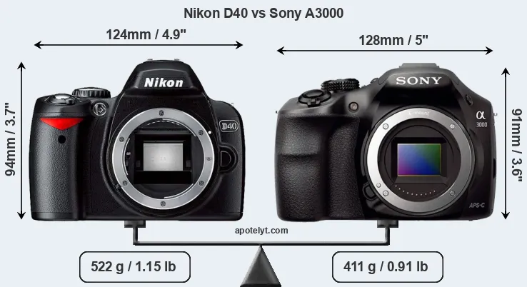 An illustration of the physical size and weight of the Nikon D40 and the Sony A3000 is provided in the side-by-side display below. The two cameras are presented according to their relative size. Three consecutive views from the front, the top, and the rear side are shown. All size dimensions are rounded to the nearest millimeter.