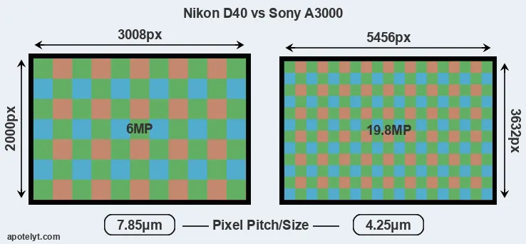 Despite having a slightly smaller sensor, the A3000 offers a higher resolution of 19.8 megapixels, compared with 6 MP of the D40. This megapixels advantage comes at the cost of a higher pixel density and a smaller size of the individual pixel (with a pixel pitch of 4.25μm versus 7.85μm for the D40). However, it should be noted that the A3000 is much more recent (by 6 years and 9 months) than the D40, and its sensor will have benefitted from technological advances during this time that make it possible to gather light more efficiently.