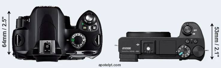 The physical size and weight of the Nikon D40 and the Sony A6500 are illustrated in the side-by-side display below. The two cameras are presented according to their relative size. Three consecutive views from the front, the top, and the rear side are shown. All size dimensions are rounded to the nearest millimeter.