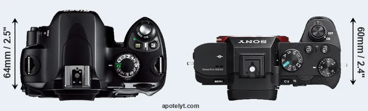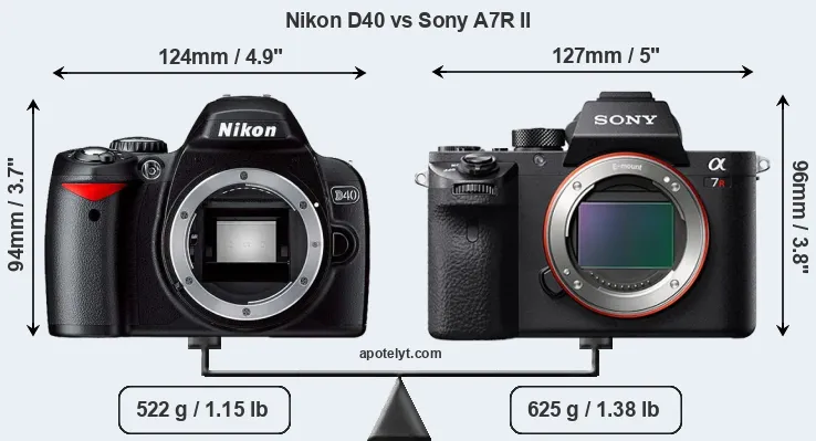 The side-by-side display below illustrates the physical size and weight of the Nikon D40 and the Sony A7R II. The two cameras are presented according to their relative size. Three consecutive perspectives from the front, the top, and the back are available. All width, height and depth measures are rounded to the nearest millimeter.