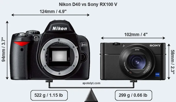 The physical size and weight of the Nikon D40 and the Sony RX100 V are illustrated in the side-by-side display below. The two cameras are presented according to their relative size. Three successive views from the front, the top, and the rear are shown. All width, height and depth dimensions are rounded to the nearest millimeter.