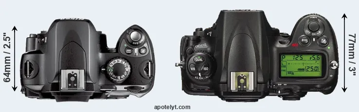 The physical size and weight of the Nikon D40X and the Nikon D700 are illustrated in the side-by-side display below. The two cameras are presented according to their relative size. Three consecutive perspectives from the front, the top, and the back are available. All width, height and depth dimensions are rounded to the nearest millimeter.