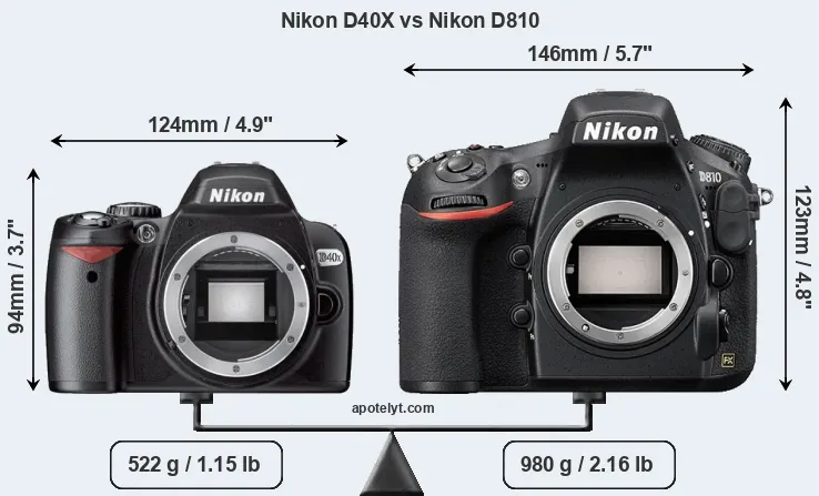 The side-by-side display below illustrates the physical size and weight of the Nikon D40X and the Nikon D810. The two cameras are presented according to their relative size. Three successive views from the front, the top, and the rear are shown. All size dimensions are rounded to the nearest millimeter.