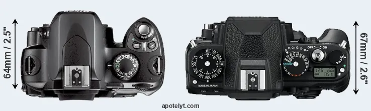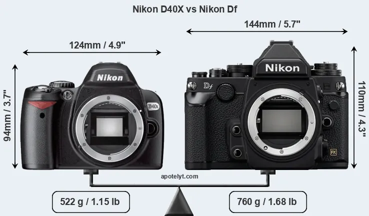 The physical size and weight of the Nikon D40X and the Nikon Df are illustrated in the side-by-side display below. The two cameras are presented according to their relative size. Three consecutive perspectives from the front, the top, and the back are available. All width, height and depth dimensions are rounded to the nearest millimeter.