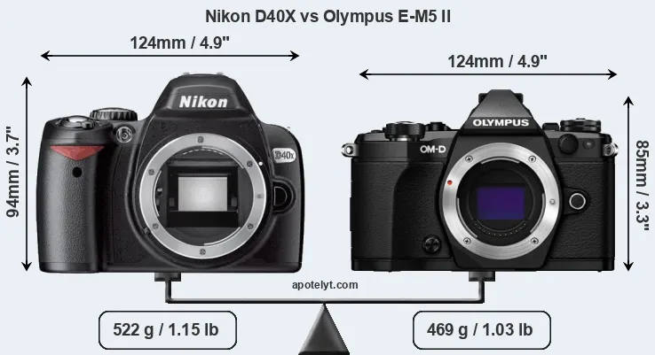 An illustration of the physical size and weight of the Nikon D40X and the Olympus E-M5 II is provided in the side-by-side display below. The two cameras are presented according to their relative size. Three consecutive views from the front, the top, and the rear side are shown. All width, height and depth measures are rounded to the nearest millimeter.