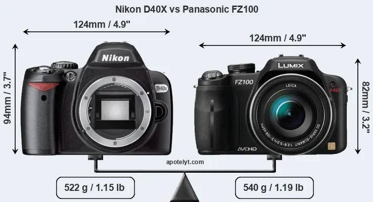 The side-by-side display below illustrates the physical size and weight of the Nikon D40X and the Panasonic FZ100. The two cameras are presented according to their relative size. Three successive views from the front, the top, and the rear are shown. All width, height and depth measures are rounded to the nearest millimeter.